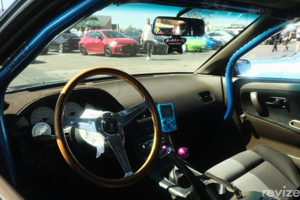 In the interior, there’s a Nardi woodgrain steering wheel, roll cage, and a translucent blue Gameboy Color.