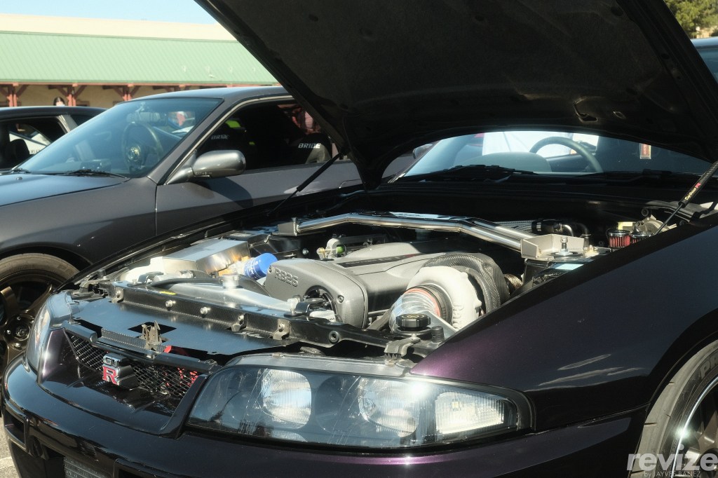 Work has been done in the engine bay of this R33. Surrounding the RB26 are: Garrett turbo charger, radiator, oil catch can, and strut tower brace to name a few.