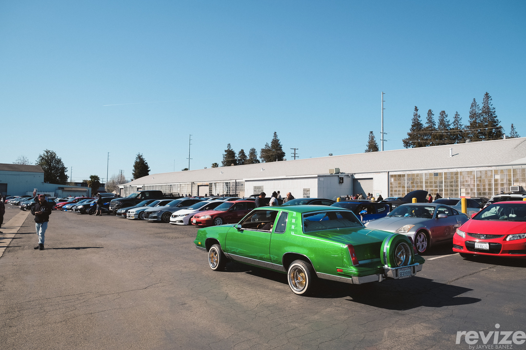 We arrived to TPS Motorsports but the small lot was full and across the street was this overflow lot. Entering into the overflow lot was this lowrider Chevy Monte Carlo in green pearl paint with subtle, contrasting accents from the gold mesh wheels and detailed airbrushing.