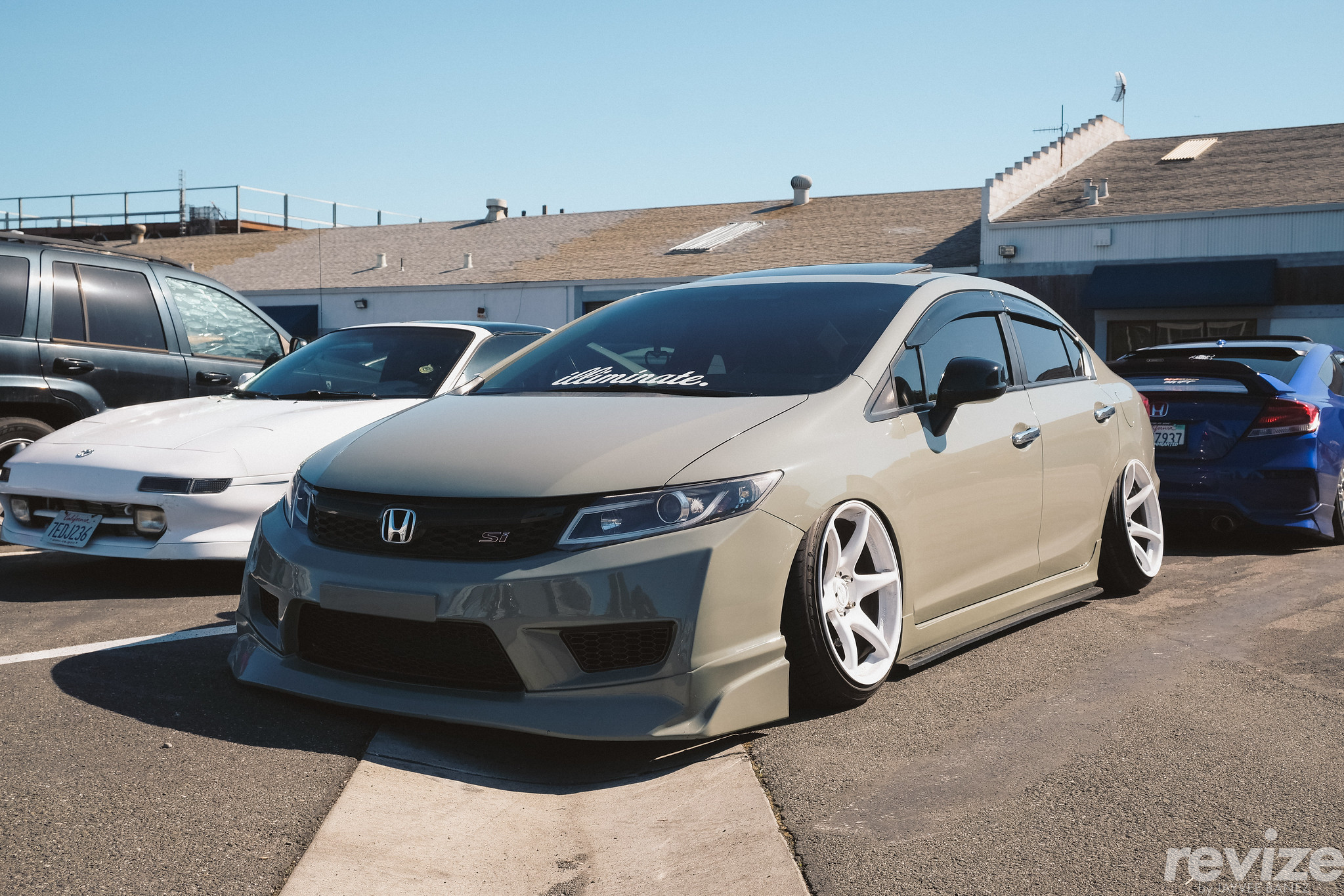 From San Jose’s local car crew, Illiminate, was Kevin Nguyen’s 9th gen Honda Civic SI (FB6). That year he redone his car in a sandstone vinyl wrap and changed his wheels to Kansei Tandems. The front bumper is an aftermarket version of an 8th gen Civic Type R bumper with a J’s Racing-style lip. The 9th gen Civic had different variants depending on the region. Although there was a 9th gen Civic Type R, it came in as a hatchback (FK2) in Asia and Europe IIRC; not the coupe or sedan that would be seen in the streets of North America. Cosmetic wise, there wasn’t that much you could do with the 9th gen Civic compared to the 8th gen Civic with Japanese aftermarkets of course.