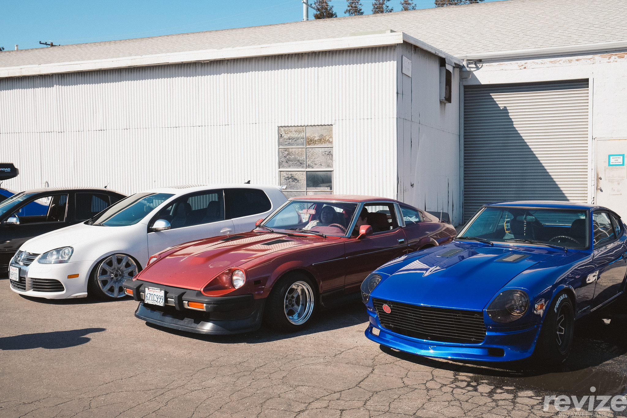 In this line-up from left to right, we have a MK5 VW Golf on a set of Bentley wheels. In the middle is a Nissan 280ZX (S130) with a simple setup consisting of Work ZE40 wheels. On the far right, the predecessor to the S130, is this Nissan 240Z (S30) with a Fatlace x AME Fzero wheelset.