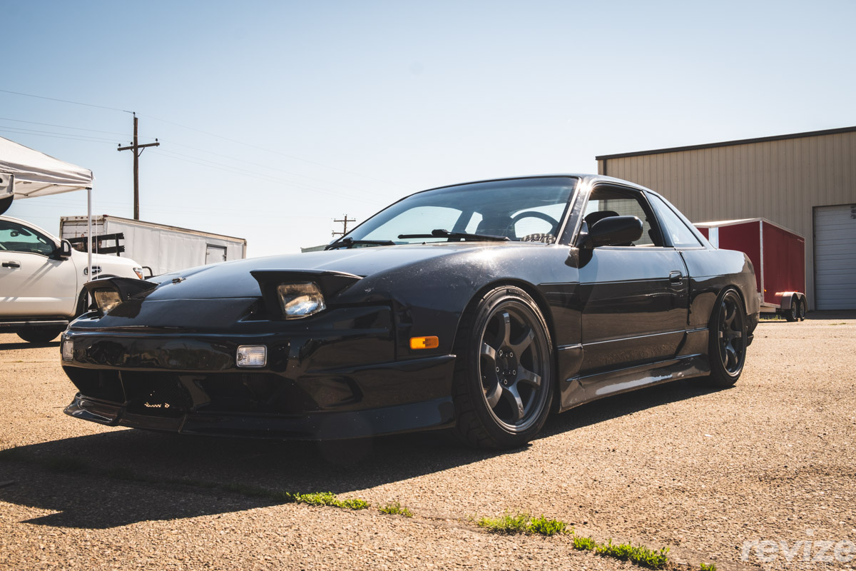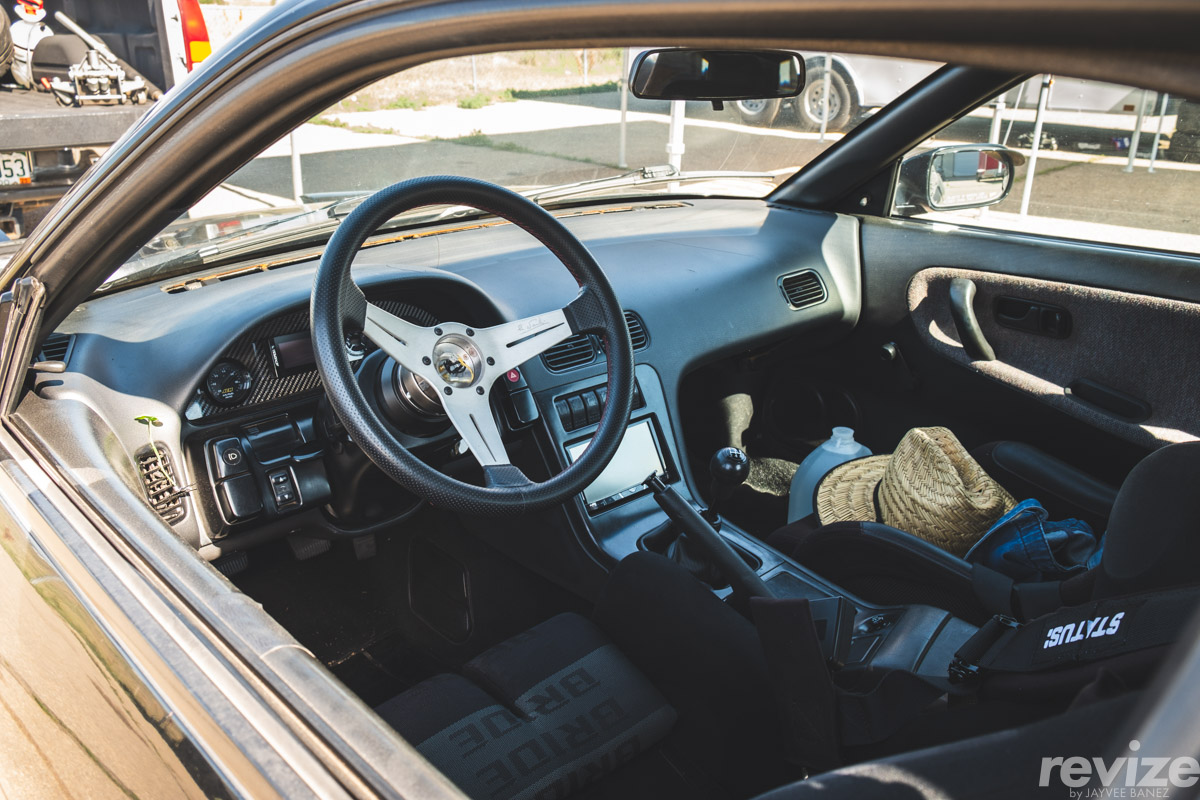 Exterior wise, it’s a stock body S13 Coupe with “sleepy” pop-up headlights, Type-X front bumper and rear spats. Super simple setup and overall clean.