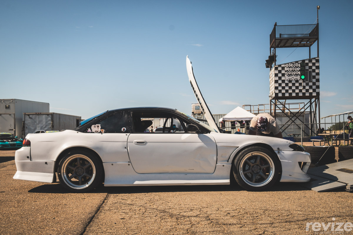 Coming off the enclosed trailer was this dedicated Pro-level drift car. It’s a S14.5 – S14 chassis with an S15 face. In the engine bay, a V8 replaces the stock 4-cylinder.