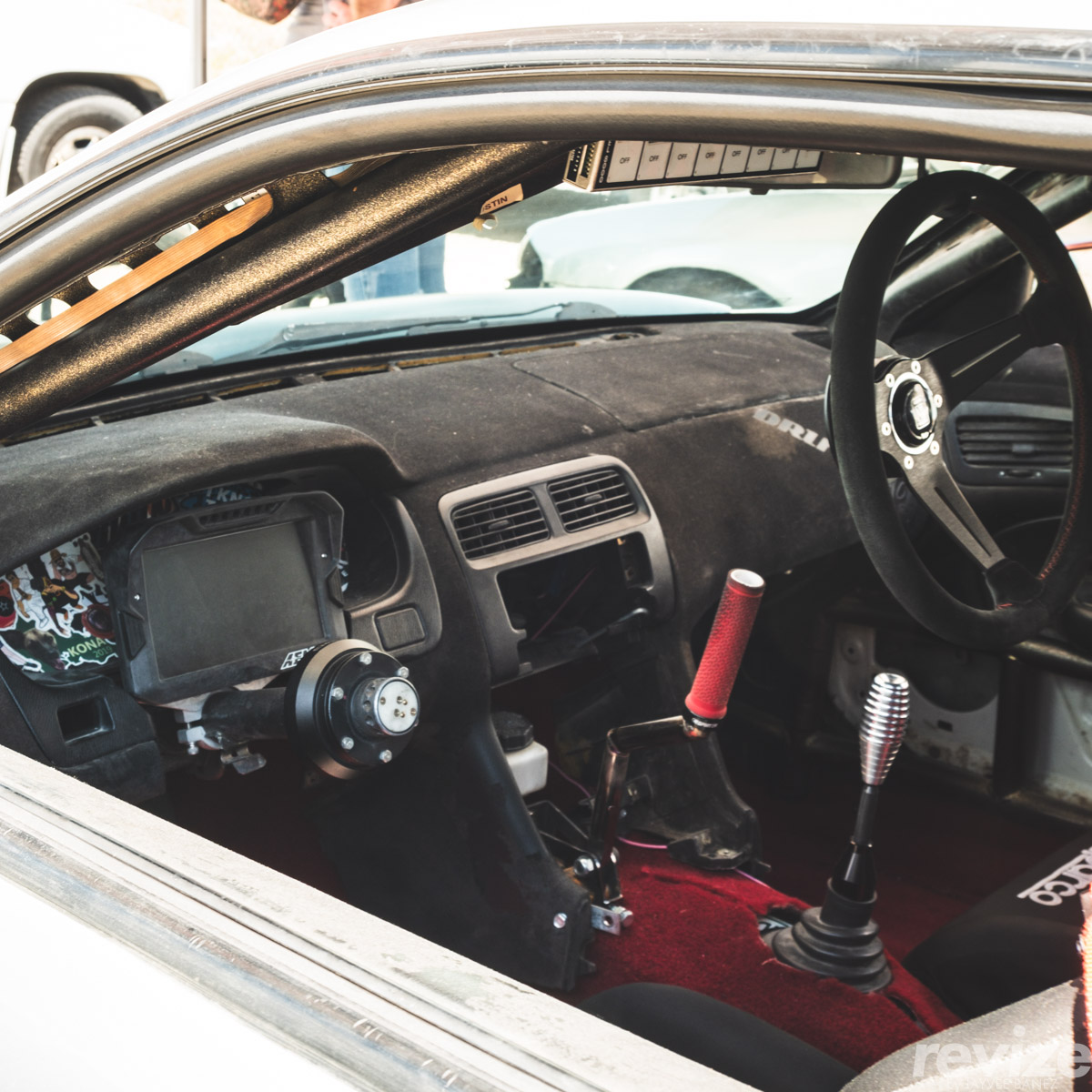 Interior-wise, the dashboard is flocked. Some pieces also include the AEM digital dash/instrument cluster, Nardi steering wheel, and hydro E-brake.
