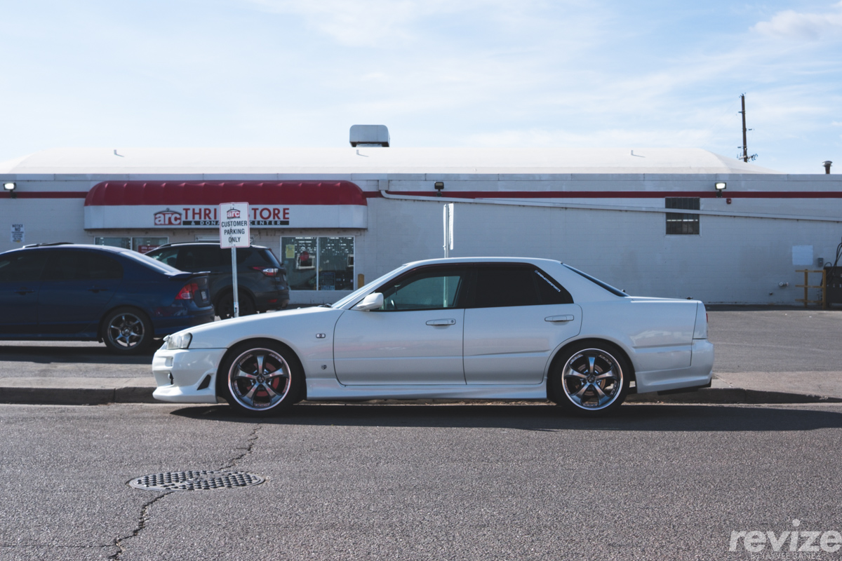 Upon arrival, 20 minutes after 9am, there were already cars parked on the street in front of Flat 6 Coffee and Co. Adjacent street parking was already occupied so I was circling blocks nearby to find a spot. I drove through alleyways, rolled up my windows as I passed by deserted lots, and avoided a homeless person. I decided to park a couple blocks down at a nearby Arc thrift store. Luckily, I was joined by this Nissan Skyline (ER34) sedan on Work VS-KF wheels.